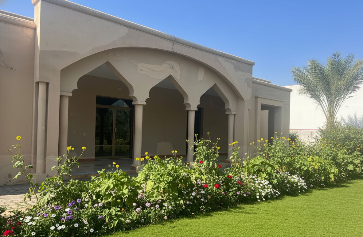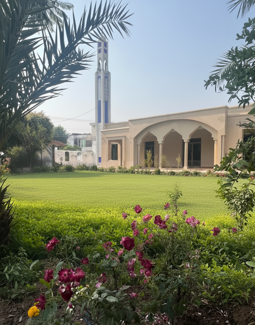 The mosque is a beautiful example of modern Islamic architecture, designed to serve both worship and learning. It combines elegance, peace, and spirituality in every detail. Built on two kanals, the structure consists of two blocks — Block A (main mosque) and Block B (library with Quran, Hadith, and Tafsir books). The main prayer hall, sized 49×36 feet, is built without any pillars, providing a spacious and open area that can accommodate around 1,000 worshippers. The ceiling is made of lightweight stone and tiles, and the courtyard features grass and flower beds. With 100% of Block B completed, the mosque presents a clean, fresh, and inspiring environment for prayer and learning